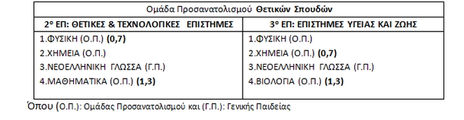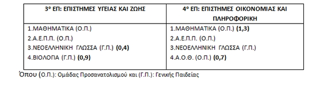 Ειδικότερα οι εναλλακτικοί συνδυασμοί πανελλαδικώς εξεταζομένων μαθημάτων της Ομάδας Προσανατολισμού Θετικών Σπουδών ανά Επιστημονικό Πεδίο και οι συντελεστές βαρύτητας των δύο μαθημάτων παρουσιάζονται στον παρακάτω πίνακα: