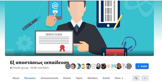 Η σελίδα της ομάδας “Eξ αποστάσεως εκπαίδευση”στο Facebook