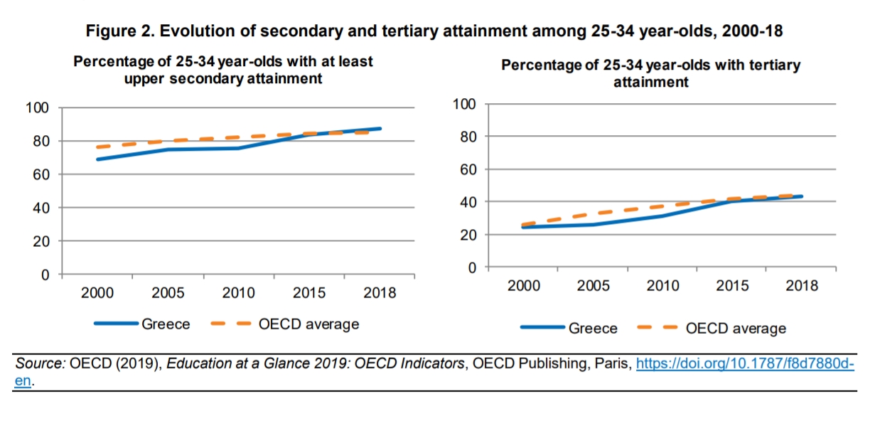 Παρόλα αυτά, η χώρα μας κατάφερε να επιτύχει μια πρωτοφανή βελτίωση στο πεδίο της υποχρεωτικής εκπαίδευσης, ακολουθώντας τους στόχους της Ε.Ε. για μείωση της σχολικής διαρροής κάτω από 10% έως το 2020. Το 2019, το ποσοστό των Ελλήνων ηλικίας 18-24 ετών που είχαν παρατήσει πρόωρα το σχολείο είχε πέσει στο 4.1%, πολύ χαμηλότερα από τον Μ.Ο. του 10.3% στην Ε.Ε. Σύμφωνα με τα στατιστικά του Οργανισμού Οικονομικής Ανάπτυξης και Συνεργασίας (ΟΟΣΑ), το 2018 σχεδόν εννέα στους δέκα Έλληνες ηλικίας 25-34 ετών είχαν τελειώσει την υποχρεωτική εκπαίδευση, μια εντυπωσιακή αύξηση 12% σε σχέση με το 2008, ενώ 43% είχαν πτυχίο ανώτερης εκπαίδευσης.