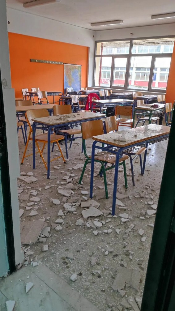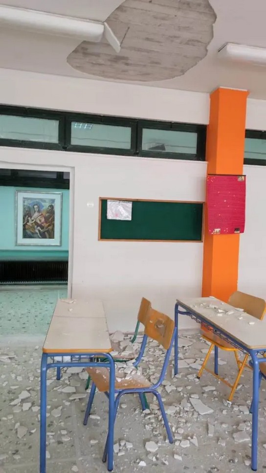 Όπως καταγράφει το trikalanews.gr, σε αίθουσα του σχολείου κι ενώ υπήρχαν μέσα μαθητές, υποχώρησε μέρος του ταβανιού. Ευτυχώς, όμως, δεν καθόταν κάποιο παιδί κάτω από το σημείο.