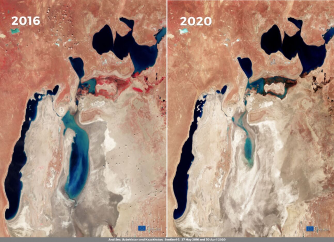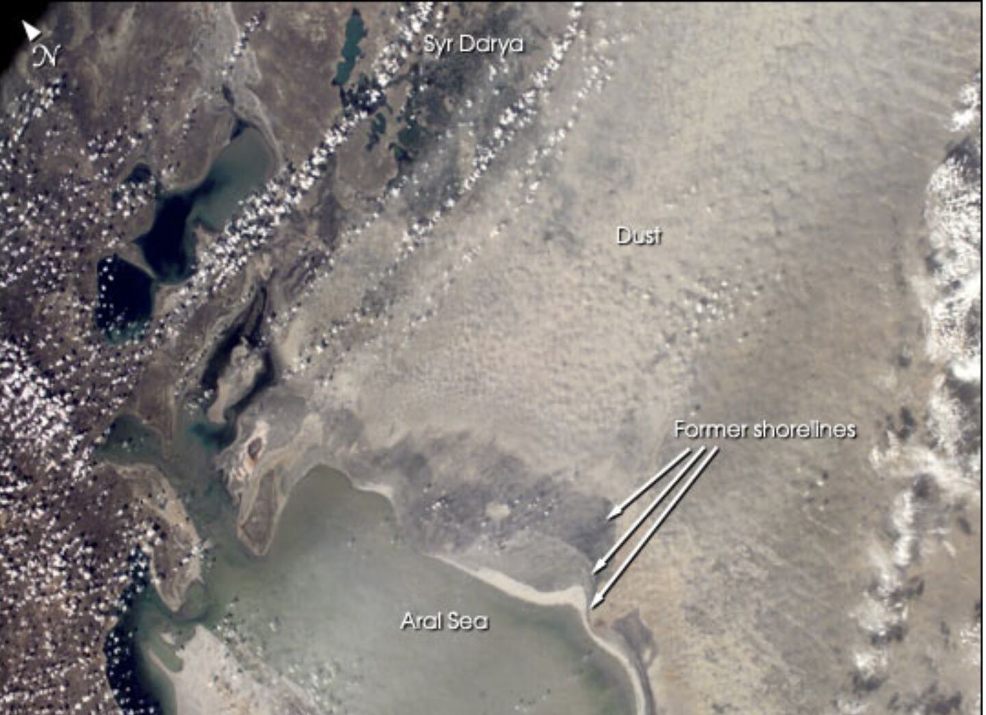 Η άλλοτε τέταρτη μεγαλύτερη λίμνη στον κόσμο έχει πλέον μετατραπεί σε έρημο. Το χώμα από τον ξηρό πυθμένα της λίμνης έχει προστεθεί στη σκόνη που στροβιλίζεται πάνω από την Κεντρική Ασία.