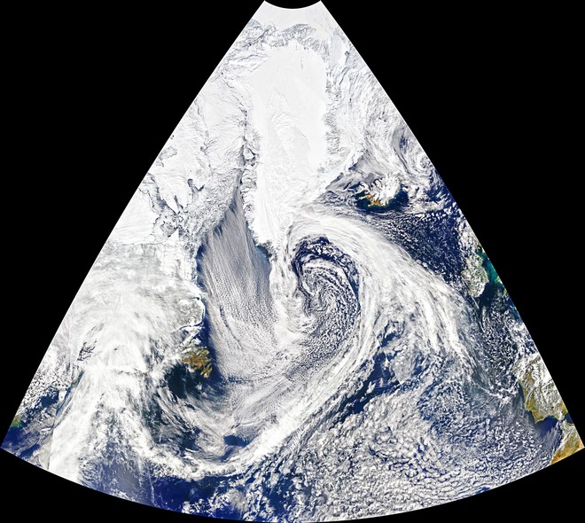 Καταγράφηκε με το φασματοραδιόμετρο απεικόνισης μέτριας ανάλυσης (MODIS) στον δορυφόρο Aqua της NASA, και η εικόνα δείχνει αυτούς τους δρόμους με τα σύννεφα να σαρώνουν τα ανοιχτά νερά μεταξύ Λαμπραντόρ, Καναδά και νοτιοδυτικής Γροιλανδίας.