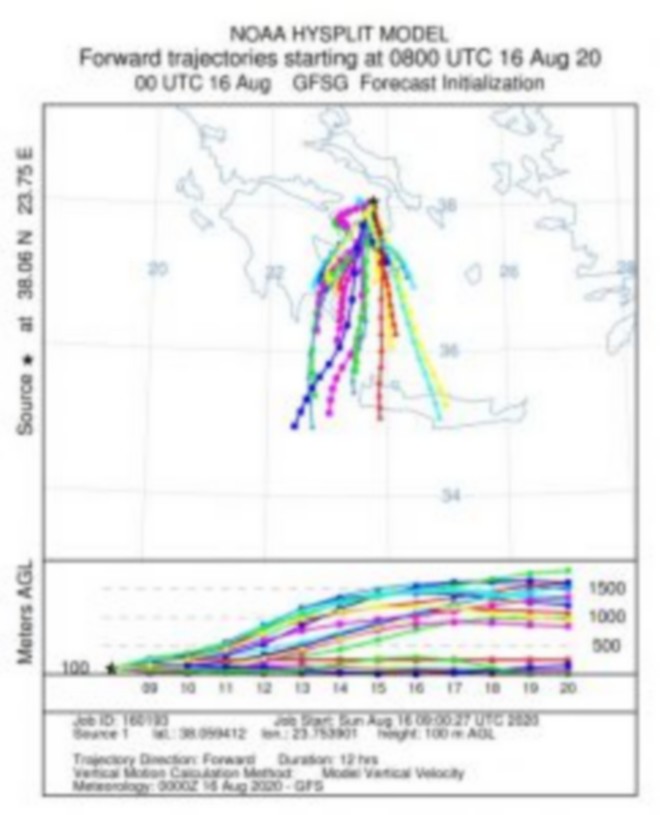 Παρακάτω δίνεται η τροχιά του καπνού για το επόμενο 12ωρο, τρέχοντας το μοντέλο διασποράς Hysplit του ΝΟΑΑ.