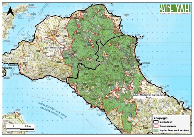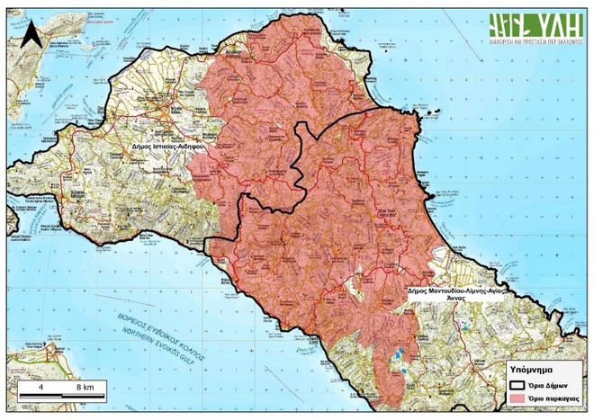 Η συνολική έκταση της πυρκαγιάς ανέρχεται σε 512.031,54 στρέμματα εκ των οποίων τα 322.188,92 βρίσκονται στον Δήμο Λίμνης – Μαντουδίου – Αγίας Άννας (ποσοστό 63%) και τα 189.842,61 τον Δήμο Ιστιαίας Αιδηψού (ποσοστό 37%), όπως αναφέρει το dasarxeio.com.