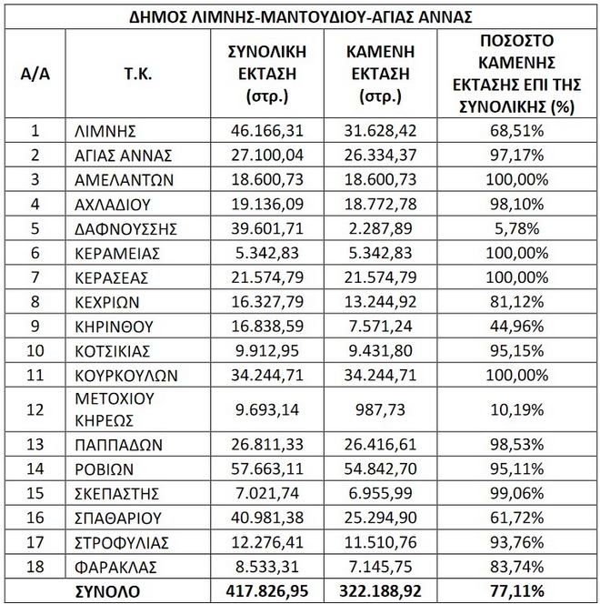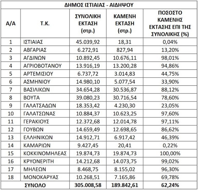 Στον πίνακα που ακολουθεί παρουσιάζονται οι Τοπικές Κοινότητες ανά Δήμος και η έκταση που έχει καεί.