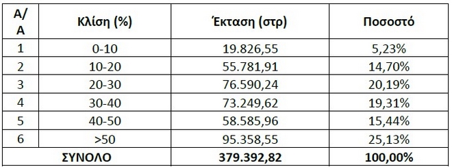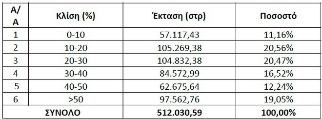 Τέλος στον πίνακα που ακολουθεί παρουσιάζονται οι κατηγορίες κλίσεων στα δάση και τις δασικές εκτάσεις που κάηκαν. Όπως προκύπτει στην περίπτωση αυτή οι εκτάσεις με κλίση μεγαλύτερη του 50% πλέον ανέρχονται στο 25,1% της συνολικής έκτασης ενώ η μέση κλίση διαμορφώνεται στο 38,5%.
