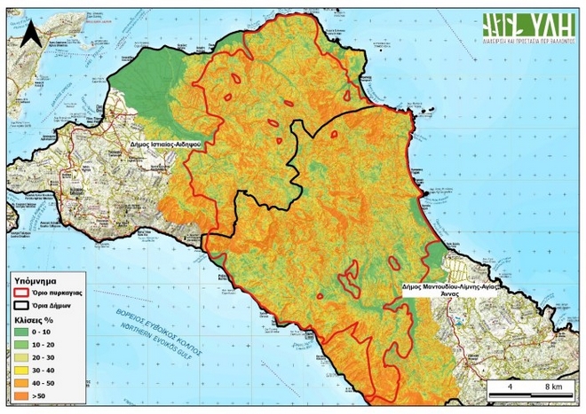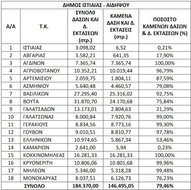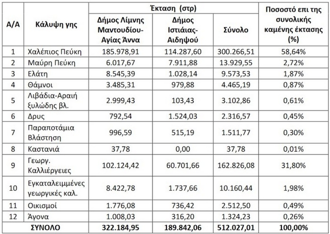 Από την συνολική έκταση των δασών και δασικών εκτάσεων των Τ.Κ. που επηρεάστηκαν από την πυρκαγιά στον Δήμο Λίμνης – Μαντουδίου – Αγίας Άννας κάηκαν το 77,20%, ενώ το αντίστοιχο ποσοστό στον Δήμο Ιστιαίας – Αιδηψού ανέρχεται στο 79,46%. Είναι χαρακτηριστικό ότι στις περισσότερες Τ.Κ. το ποσοστό αυτό ξεπερνάει το 90% και φτάνει έως και το 100% των δασών και δασικών εκτάσεων που υπήρχαν.