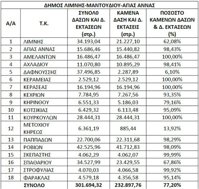 Από την ανάλυση των στοιχείων των αναδασωτέων εκτάσεων του αναρτημένου δασικού χάρτη της Π.Ε. Εύβοιας προκύπτει, ότι από τα καμένα δάση και δασικές εκτάσεις που ανέρχονται σε 379.392,82 στρέμματα τα 150.025,47 έχουν κηρυχτεί στο παρελθόν ξανά αναδασωτέα. Από τα παραπάνω προκύπτει δηλαδή ότι το 39,54% τον καμένων δασών έχει ξανά καεί στο παρελθόν, ενώ στον Δήμο Λίμνης – Μαντουδίου – Αγίας Άννας το ποσοστό αυτό αγγίζει το 50%.