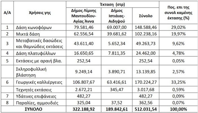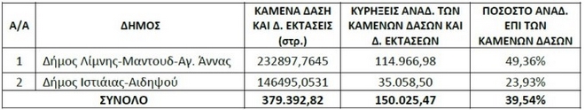 Σύμφωνα με τον αναρτημένο Δασικό Χάρτη της Διεύθυνσης Δασών Π.Ε. Εύβοιας το σύνολο των δασών και δασικών εκτάσεων που έχουν καεί, ανέρχεται σε 379.392,82 στρέμματα και αποτελούν το 74,1% της συνολικής καείσας έκτασης. Από την συνολική έκταση των δασών και δασικών εκτάσεων τα 232.897,76 στρέμματα βρίσκονται εντός του Δήμου Λίμνης – Μαντουδίου – Αγίας Άννας (ποσοστό 61,39%) και τα 146.495,05 στον Δήμο Ιστιαίας Αιδηψού (ποσοστό 38,61%).