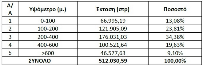 Από την επεξεργασία των δεδομένων του Ψηφιακού Μοντέλου Εδάφους (DTM) της Ελληνικό Κτηματολόγιο προκύπτει για την περιοχή που επλήγη από την πυρκαγιά ότι το ελάχιστο υψόμετρο βρίσκεται στο επίπεδο της θάλασσας (0 μ.) και το μέγιστό 989 μ. και το μέσο υψόμετρο 303 μ. Το 27% της έκτασης έχει υψόμετρο λιγότερο από 200μ., το 35% αυτής βρίσκεται σε υψόμετρο μεταξύ 200 και 400 μέτρων, ενώ μόνο το 9% βρίσκεται πάνω από τα 600 μέτρα. Στον πίνακα που ακολουθεί παρουσιάζεται η κατανομή της έκτασης στις κλάσεις υψομέτρων.