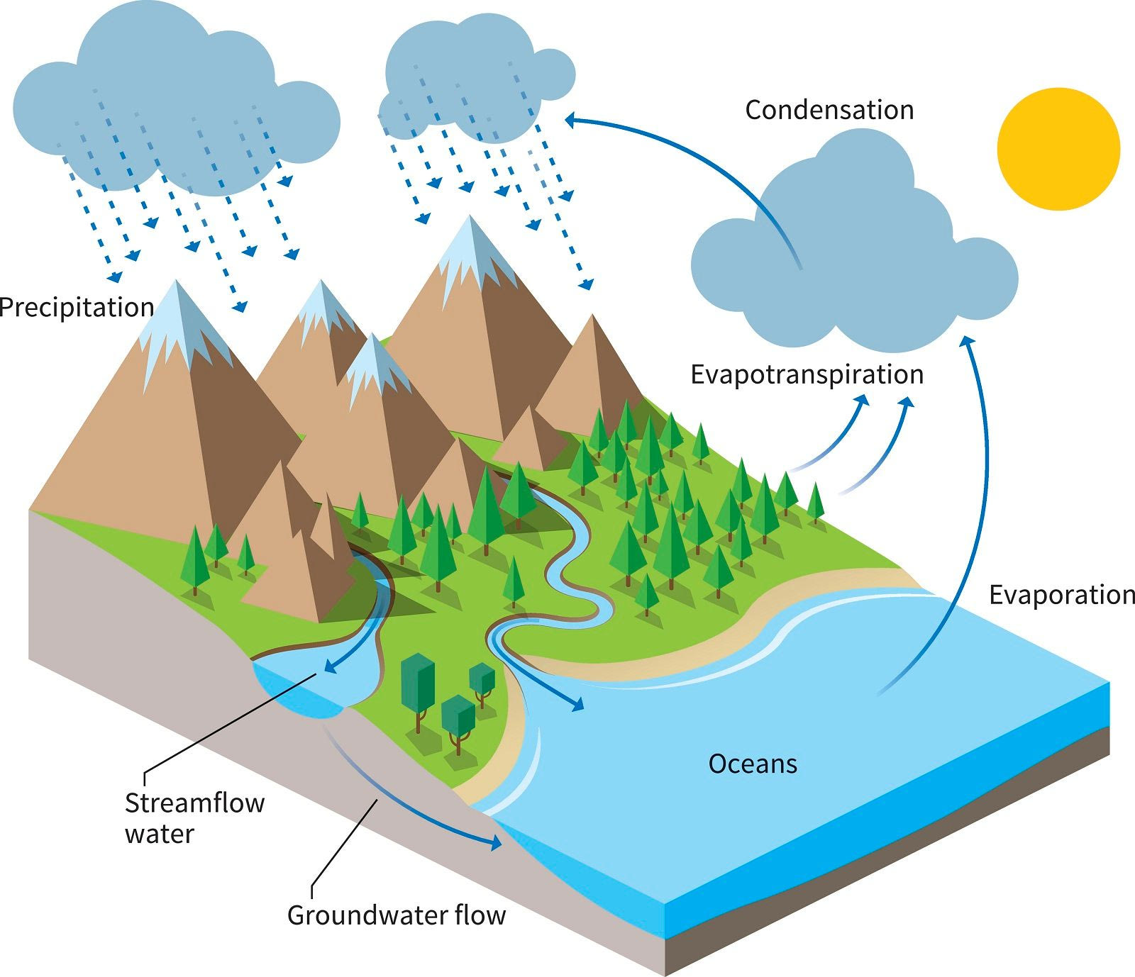 Συγκεκριμένα, το νερό από τους ωκεανούς, τις λίμνες και τα ποτάμια εξατμίζεται λόγω της θερμότητας του ήλιου και μετατρέπεται σε υδρατμούς. Οι υδρατμοί ανεβαίνουν στην ατμόσφαιρα, όπου ψύχονται και σχηματίζουν σύννεφα.