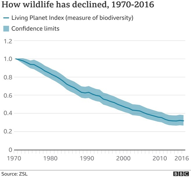 Καθώς τα δάση καίγονται, η υπεραλίευση μαίνεται και πολλοί βιότοποι καταστρέφονται, η άγρια ζωή βρίσκεται σε “ελεύθερη πτώση”. Συγκεκριμένα από το 1970 έως και το 2016 η μελέτη κατέγραψε μείωση της τάξης του 68% κατά μέσο όρο σε περισσότερους από 20.000 πληθυσμούς θηλαστικών, πτηνών, αμφίβιων, ερπετών και ψαριών.