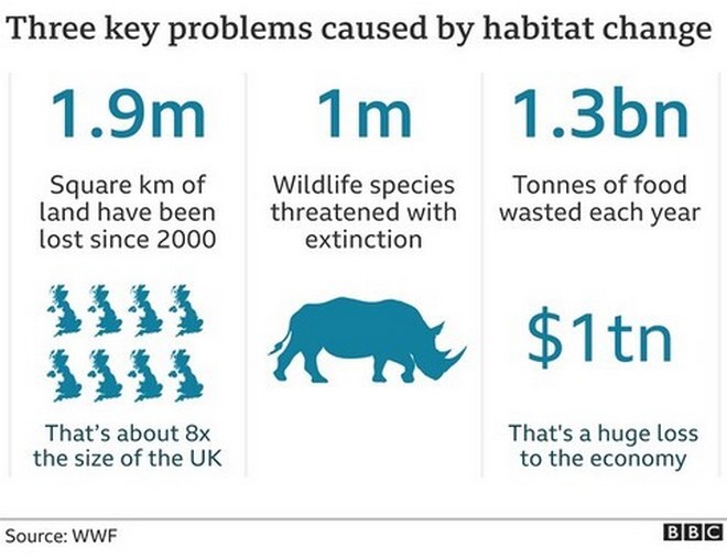 Όπως επισημαίνεται στην έκθεση “Ζωντανός Πλανήτης 2020″ του WWF, η κύρια αιτία για τη δραματική μείωση των πληθυσμών των χερσαίων ειδών που περιλαμβάνονται στον LPI είναι η απώλεια και υποβάθμιση των οικοτόπων, συμπεριλαμβανομένης της αποδάσωσης, που οφείλεται στον τρόπο με τον οποίο εμείς, ως ανθρωπότητα, παράγουμε τροφή.