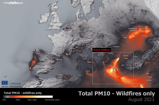 Πιο συγκεκριμένα, σύμφωνα με προκαταρκτικά δεδομένα από την υπηρεσία Υπηρεσία Παρακολούθησης της Ατμόσφαιρας (CAMS) του Copernicus τα οποία επεξεργάστηκε η επιστημονική ομάδα του climatebook, παρατηρείται πως η πιο επιβαρυμένη περιοχή της Ευρώπης σε ποιότητα αέρα για τον Αύγουστο 2023 ήταν η Ελλάδα και η περιοχή της Νοτιοανατολικής Μεσογείου.