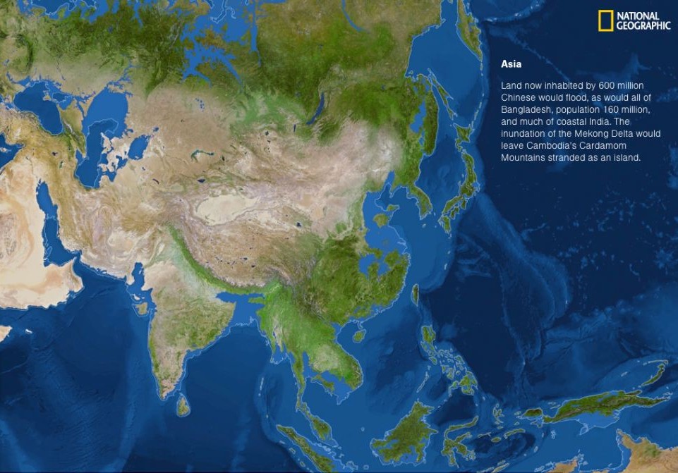 Στην Ασία, 600 περίπου μίλια της αχανούς κινεζικής γης θα πλημμυρίσουν, όπως και όλο το Μπαγκλαντές αλλά και μεγάλο μέρος της παράκτιας Ινδίας.