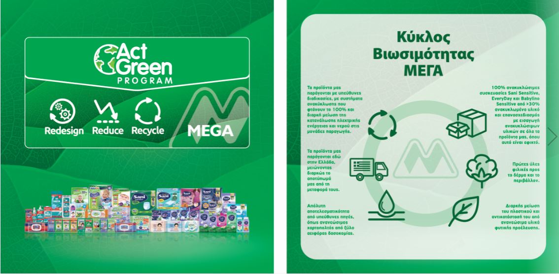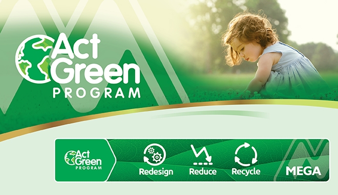 Το Act Green από την εταιρεία ΜΕΓΑ είναι ένα ολοκληρωμένο πρόγραμμα, το οποίο ενσωματώνει 3 σημαντικούς πυλώνες για την προώθηση της Βιώσιμης Ανάπτυξης, τους τομείς Redesign – Reduce – Recycle. Ένα πρόγραμμα το οποίο στοχεύει στη δημιουργία θετικού αντικτύπου βιωσιμότητας μέσω του ουσιαστικού επανασχεδιασμού των προϊόντων της εταιρείας (REDESIGN), υιοθετώντας τις αρχές της κυκλικής οικονομίας, επιτυγχάνοντας εξοικονόμηση πόρων (REDUCE) και σημαντικά επίπεδα επαναχρησιμοποίησης υλικών (RECYCLE).