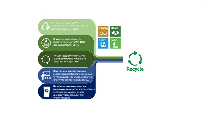 - Αύξηση της χρήσης σακουλών συσκευασίας του περιέχουν ανακυκλωμένο πλαστικό (πλήρως ελεγχόμενου κύκλου ανακύκλωσης): αρχικά σε ποσοστό 30% έως το 2030 και έπειτα σε ποσοστό 50% έως το 2050