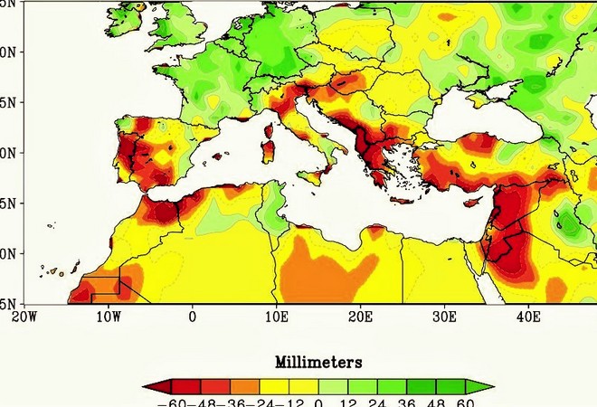 Η περιοχή της Μεσογείου, η οποία θα παρουσιάσει τη μεγαλύτερη μείωση προβλεπόμενων βροχοπτώσεων από οποιαδήποτε άλλη χερσαία επιφάνεια στη Γη.