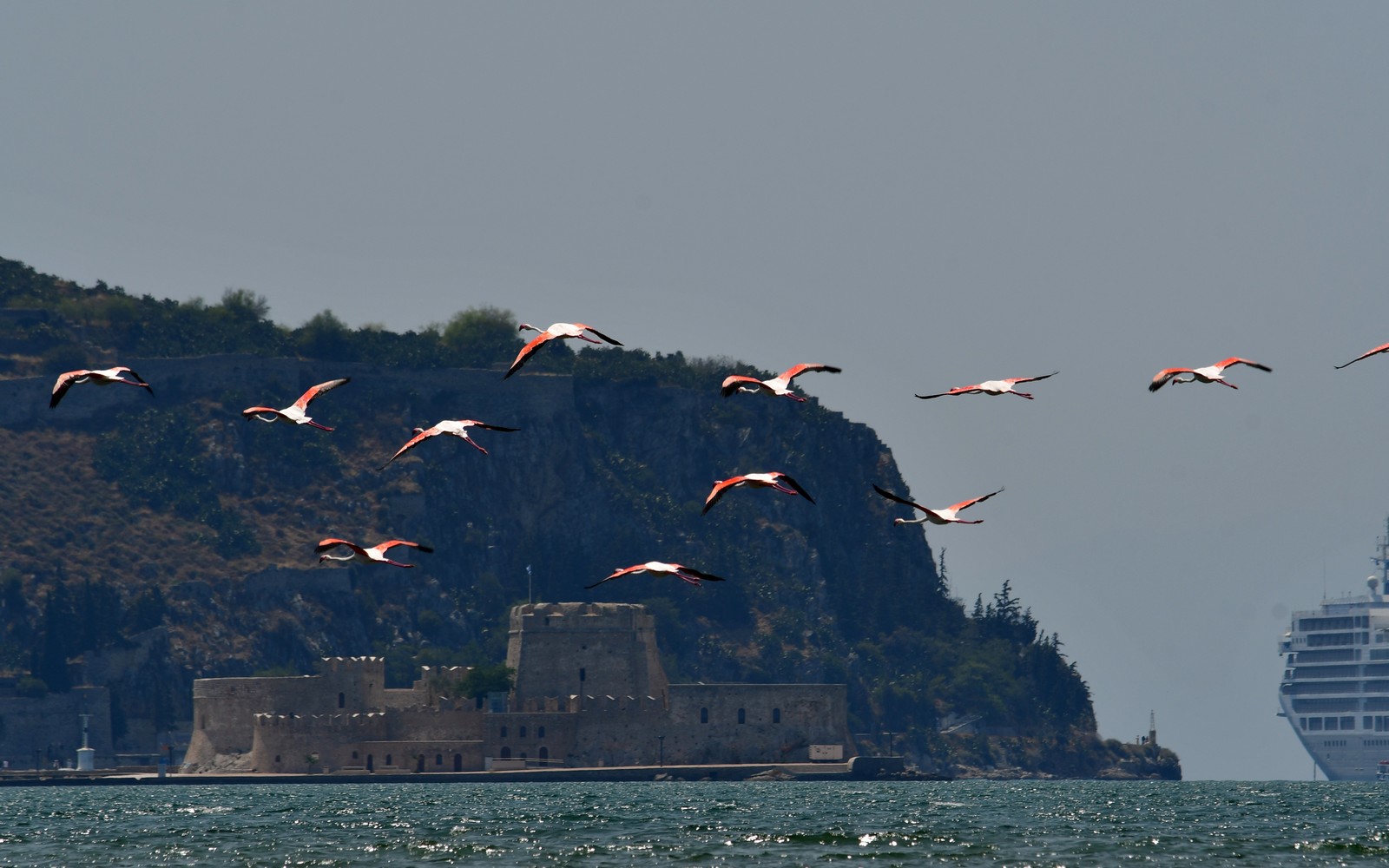 Ο καύσωνας και οι πυρκαγιές που μαίνονται σε όλη την χώρα έφεραν 25 πανέμορφα φλαμίνγκο στην παραλία του Ναυπλίου.