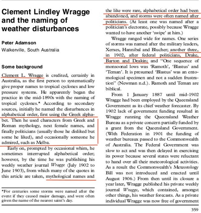 Σε Παγκόσμιο επίπεδο ο πρώτος μετεωρολόγος που υλοποίησε την ονοματοδοσία των τυφώνων και των τροπικών καταιγίδων ήταν ο Αυστραλοεγγλέζος Clement Wragge στην Αυστραλία . Ο Wragge έφυγε από την Αγγλία για την Αυστραλία το 1883 και την 1η Ιανουαρίου 1887 όπου διορίστηκε κυβερνητικός μετεωρολόγος για το Κουίνσλαντ. Παντρεύτηκε στις 13 Σεπτεμβρίου 1877 την Leonora Edith Florence d’Eresby Thornton.
