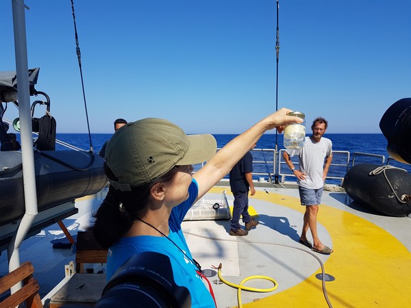 Η Χριστίνα Ζέρη, χημικός – ωκεανογράφος του Ελληνικού Κέντρου Θαλασσίων Ερευνών (ΕΛΚΕΘΕ), μαζί με τον Αλόνσο, μέλος του πληρώματος του Rainbow Warrior 3, πλένουν και προετοιμάζουν το ειδικό δίχτυ «Manta», με το οποίο πραγματοποιείται η έρευνα στα επιφανειακά νερά. Διαδικασία απαραίτητη ώστε να αφαιρεθεί οποιοδήποτε ξένο σώμα που μπορεί να βρίσκεται πάνω του και μπορεί να αλλοιώσει τα αποτελέσματα της έρευνας. Το «Manta» είναι μια κατασκευή από αλουμίνιο με δύο ξύλινα πτερύγια, που επιπλέει και τραβάει το δίχτυ στο οποίο γίνεται η συλλογή του νερού και των σωματιδίων.