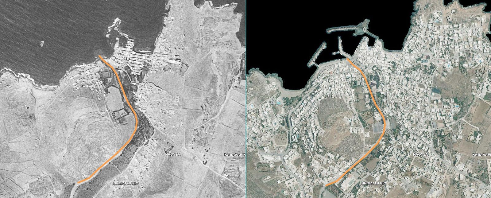 Εικόνα 2. Αεροφωτογραφίες των περιόδων 1945-1960 (αριστερή εικόνα) και 2015-2016 (δεξιά εικόνα), από το Εθνικό Κτηματολόγιο. Με πορτοκαλί γραμμή φαίνεται η χάραξη του ρύακα.