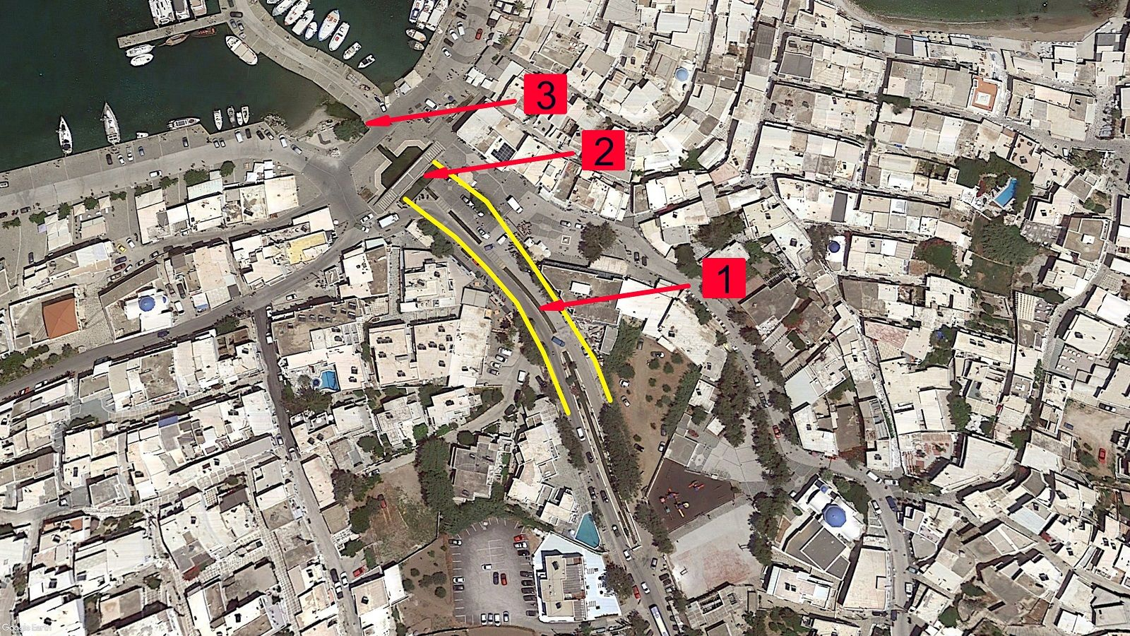Εικόνα 3. Οι παρεμβάσεις στο τελευταίο τμήμα του ρύακα, κοντά στην εκβολή του. Στην εικόνα φαίνονται η παλιά κοίτη του χειμάρρου (κίτρινες γραμμές), το μικρό τσιμεντένιο κανάλι στο κέντρο του χειμάρρου (1), η πεζογέφυρα (2) και η έξοδος του χειμάρρου σε σχέση με το μώλο (3)