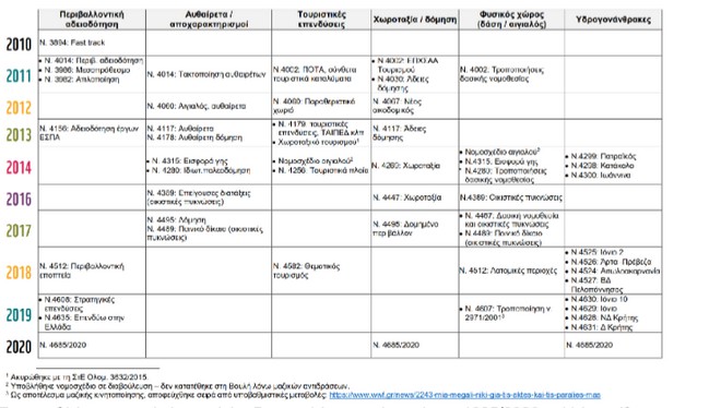 Άλλο παράλογο χαρακτηριστικό της ελληνικής περιβαλλοντικής πραγματικότητας είναι ότι οι παρανομίες συνέχεια ‘βολεύονται’. Δείτε στον παραπάνω πίνακα πόση φαιά ουσία έχει αφιερώσει η νομοθετική εξουσία τα τελευταία χρόνια για να νομιμοποιεί αυθαιρεσίες. Και πείτε με το χέρι στην καρδιά: πόσο εύκολα θα έρθει ένας καλοπροαίρετος, νομοταγής και περιβαλλοντικά ευαίσθητος επιχειρηματίας να εφαρμόσει τους νόμους, όταν γνωρίζει πως ο παράνομος ζει και βασιλεύει, με τη Βουλή να νομοθετεί συνεχώς υπέρ του;