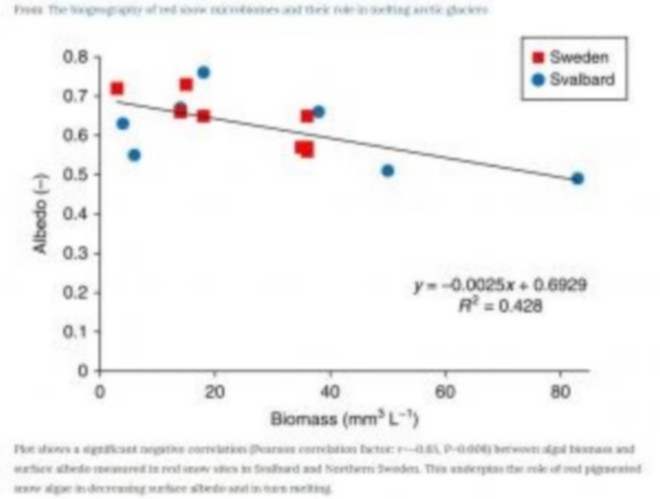 Το ερώτημα που καλούνται να απαντήσουν οι επιστήμονες είναι αν μπορεί άραγε αυτή η αλλαγή να προκαλέσει ένα θετικό βρόχο ανατροφοδότησης , δηλαδή η περισσότερη τήξη χιονιού, να επιφέρει επερισσότερη άλγη ανθών, άρα σκοτεινότερη επιφάνεια, χαμηλό albedo, άρα υψηλότερη θερμοκρασία, περισσότερη τήξη χιονιού ; Πολλά άρα…