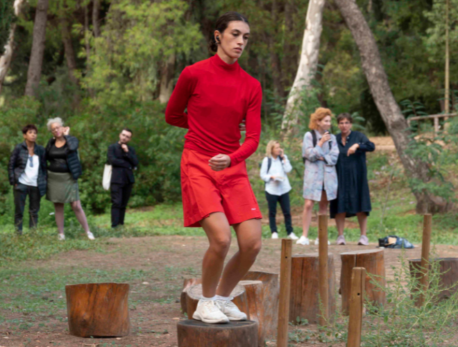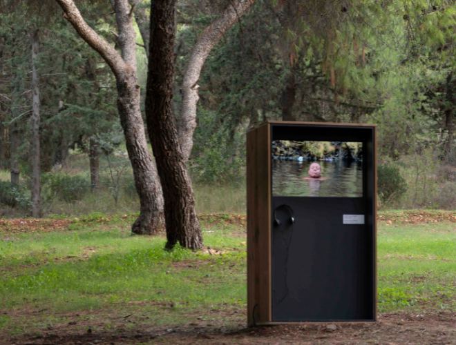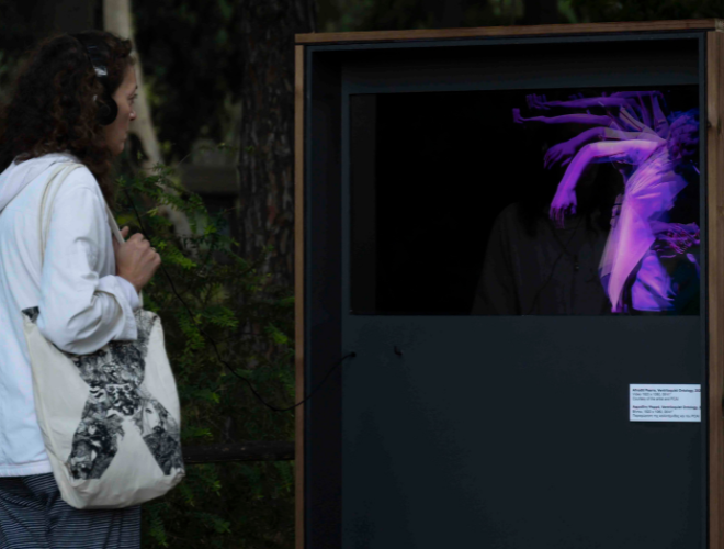 Τα βίντεο προβάλλονται μέσα σε μεγάλα ξύλινα κουτιά που μοιάζουν να έχουν φυτρώσει μέσα από το χώμα, ενώ σε ένα ξέφωτο παγκάκια και μεγάλα τραπέζια “απαγγέλουν” ποίηση, αρκεί να φορέσεις το ζευγάρι ακουστικών που θα βρεις ακουμπισμένο πάνω τους. Ανάμεσά τους το ποίημα Good Girl της Selina Nwulu.