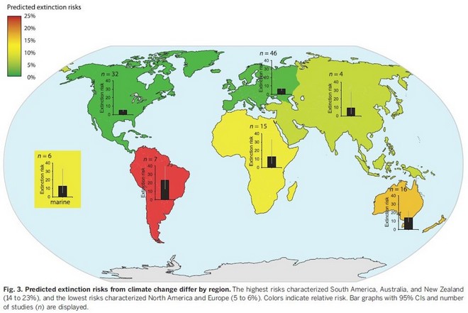 Κάθε επιπλέον βαθμός ανόδου της θερμοκρασίας θα σημαίνει δραματική επιτάχυνση της καταστροφής, προειδοποιεί ο Urban. Τα ζώα που διατρέχουν τον μεγαλύτερο κίνδυνο είναι τα αποδημητικά καθώς και διάφορα είδη που ζουν στη Νέα Ζηλανδία, την Αυστραλία και σε διάφορες περιοχές της Νοτίου Αμερικής.