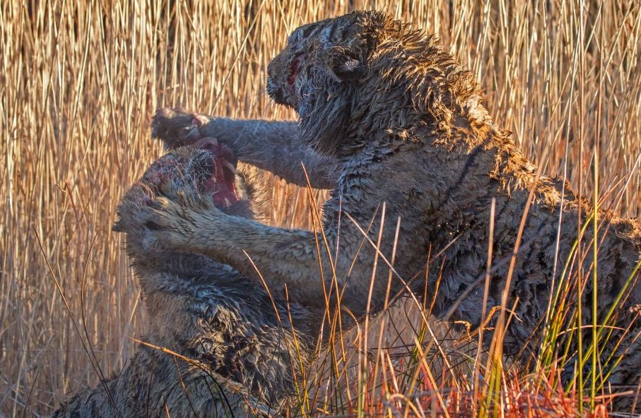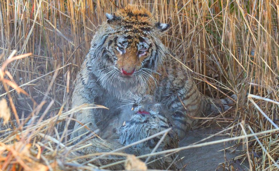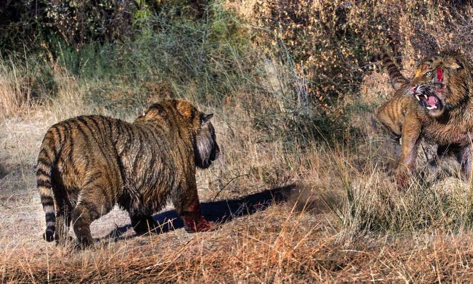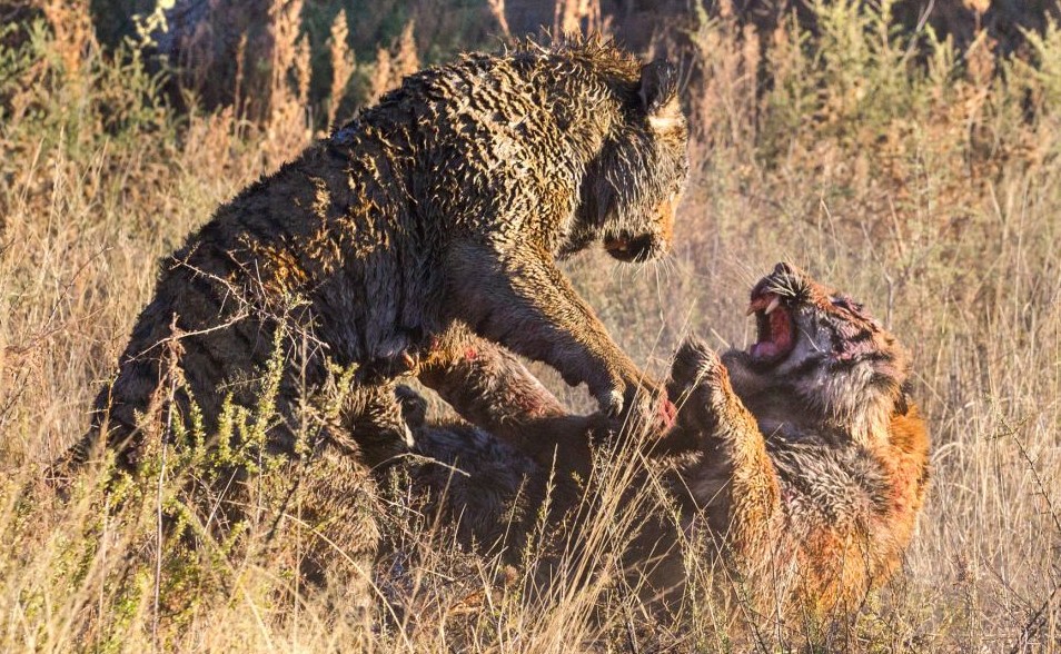 Είναι η δραματική στιγμή που δυο τίγρεις παλεύουν μέχρι τελικής πτώσης με αποτέλεσμα από τις δαγκωματιές και τις νυχιές να ματώσουν.