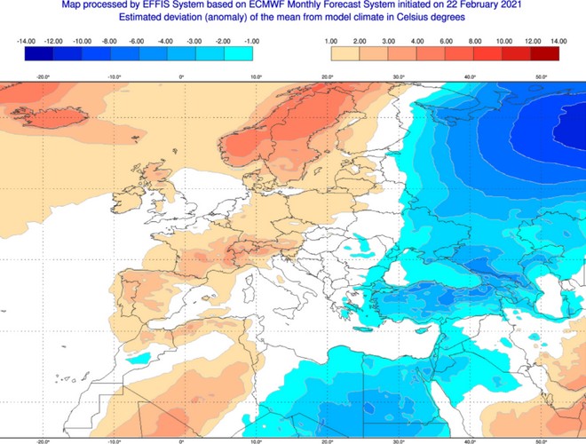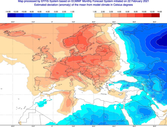 Με αίθριο καιρό υψηλές θερμοκρασίες θα φύγει ο Φεβρουάριος από την χώρα μας αλλά και από όλες σχεδόν τις Ευρωπαϊκές χώρες και με θερμοκρασίες ακόμη και κατά 6 βαθμούς πάνω από την Μέση Κλιματική τιμή ειδικά στη Γερμανία και τις Σκανδιναβικές χώρες όπως απεικονίζεται στην εισαγωγική εικόνα του άρθρου.