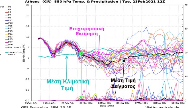 Η μεταβολή στο θερμοκρασιακό προφίλ της ατμόσφαιρας στη στάθμη των 850 hPa που σας παρουσιάζουμε πολύ συχνά , δείχνει οτι ειδικότερα για την Αθήνα η αλλαγή θα γίνει εμφανής στο ξεκίνημα του Μάρτη. οταν η επιχειρησιακή εκτίμηση της θερμοκρασίας βρεθεί κάτω από την μέση κλιματική τιμή. Η μεταβολή αυτή της θερμοκρασίας θα κρατήσει ένα πενθήμερο και μετά υπάρχει μια γενική τάση να επανέλθει σε κανονικές τιμές. Δεν επεκτεινόμαστε όμως περαιτέρω διότι οι αποκλίσεις είναι μεγάλες και αυτό διακρίνεται ξεκάθαρα στο μετεώγραμμα. Καλύτερη εικόνα μπορείτε να πάρετε παρακολουθώντας το παρακάτω βίντεο που διακρίνεται αυτή η μεταβολή του καιρού/