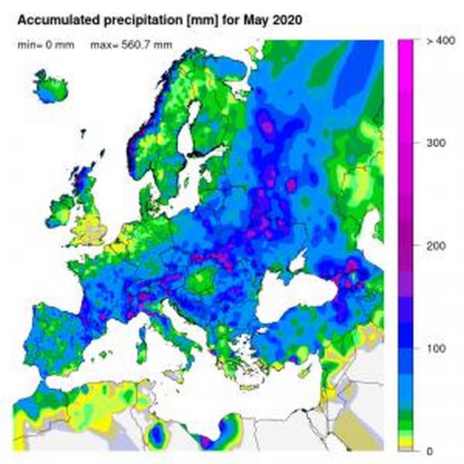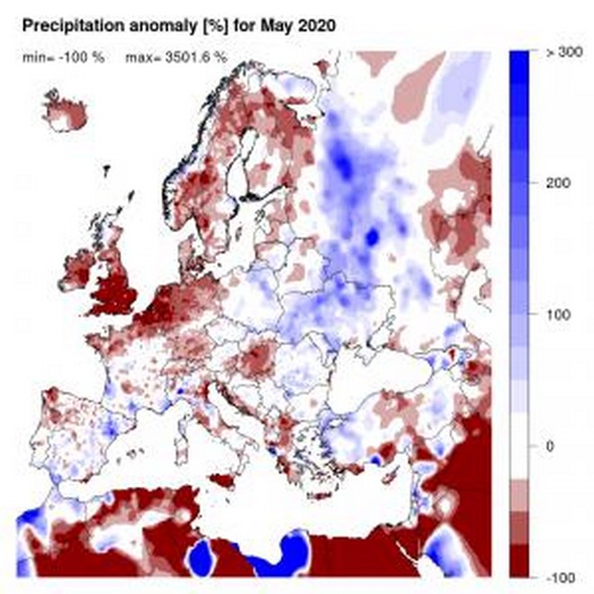 Τα υψηλότερα σύνολα υετού το Μάιο του 2020 παρατηρήθηκαν στις Άλπεις, τον Καύκασο, την Ανατολική Ευρώπη και τις Νορβηγικές ακτές. Από την άλλη πλευρά, καμία ή σχεδόν καθόλου ποσότητα υετού σημειώθηκε στις περιοχές της Αγγλίας, του Βελγίου και των περισσότερων περιοχών από τη βόρεια Αφρική.