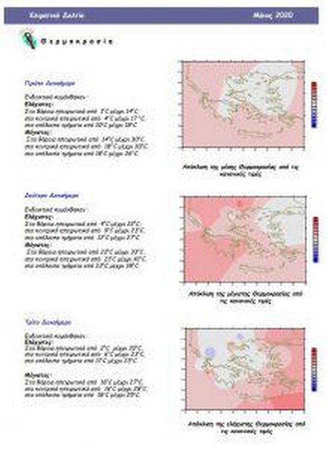 Ο Μάιος χαρακτηρίστηκε από τον καύσωνα της περιόδου 15-20/5 με πολλά ρεκόρ μέγιστων θερμοκρασιών στην Ελλάδα, ενώ ακολούθησε ένα ψυχρό δεκαήμερο με βροχές.