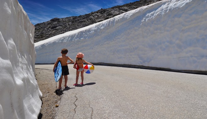 Μέσα Μαΐου, καθαρός ουρανός, ήλιος και ζέστη μεν, παγωμένα “τείχη” ύψους 8 μέτρων δε! Όλη η αντίφαση των κλιματολογικών συνθηκών σε μία φωτογραφία, που τραβήχτηκε αυτές τις ημέρες από τον εκπαιδευτικό, Αλέξανδρο Ρονιώτη. Ο ίδιος ανέβασε την επιβλητική φωτογραφία που δείχνει τα παιδιά του σε καλοκαιρινούς ρυθμούς να διασχίζουν το συγκεκριμένο σημείο, με το χιόνι στις άκρες να φτάνει τα 8 μέτρα!
