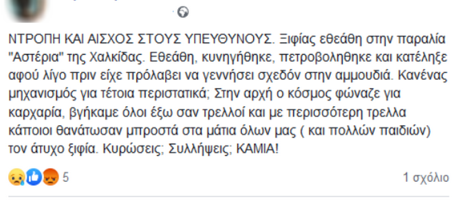 Η σκληρή αντιμετώπιση του ξιφία έχει προκαλέσει πλήθος αντιδράσεων από μάρτυρες του συμβάντος που έσπευσαν να γράψουν την άποψή τους στο λογαριασμό της πλαζ στο Facebook.