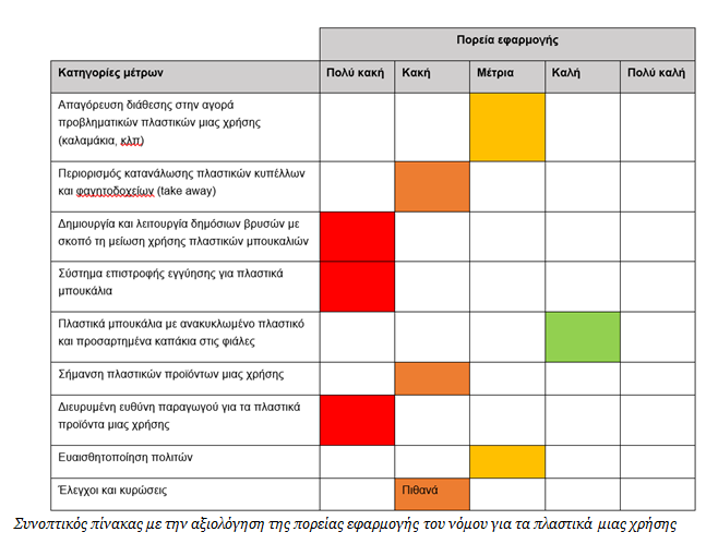 Το μόνο θετικό σημείο που καταγράφει η έκθεση είναι η εφαρμογή κάποιων ρυθμίσεων του νόμου για τα πλαστικά μπουκάλια. Πολλές επιχειρήσεις έχουν κινητοποιηθεί και ήδη διαθέτουν στην αγορά πλαστικές φιάλες από PET που περιέχουν ανακυκλωμένο πλαστικό πάνω από 25%, αλλά και μπουκάλια με προσαρτημένα καπάκια, παρότι δίνεται περιθώριο εφαρμογής των μέτρων αυτών μέχρι τον Ιανουάριο του 2025 και τον Ιούλιο του 2024, αντίστοιχα.