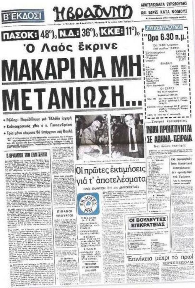 Έχουν περάσει 39 χρόνια από τότε. Όμως το βράδυ της 18ης Οκτωβρίου του 1981, που το ΠΑΣΟΚ κέρδισε τις εκλογές εκθρονίζοντας όχι την Νέα Δημοκρατία αλλά την “Δεξιά”, με το εντυπωσιακό 48%, δεν έχει όμοιό του στην μεταπολιτευτική ιστορία. Το ΠΑΣΟΚ του Ανδρέα Παπανδρέου έκανε τον κύκλο του, με την άνοδο, την ακμή και την παρακμή του. Όμως στο απόγειο του, που εκτείνεται από το 1981 έως το 1986, διαμόρφωσε την μεγαλύτερη, ίσως, πολιτική και κοινωνική μεταβολή που γνώρισε η χώρα μετά το 1974.