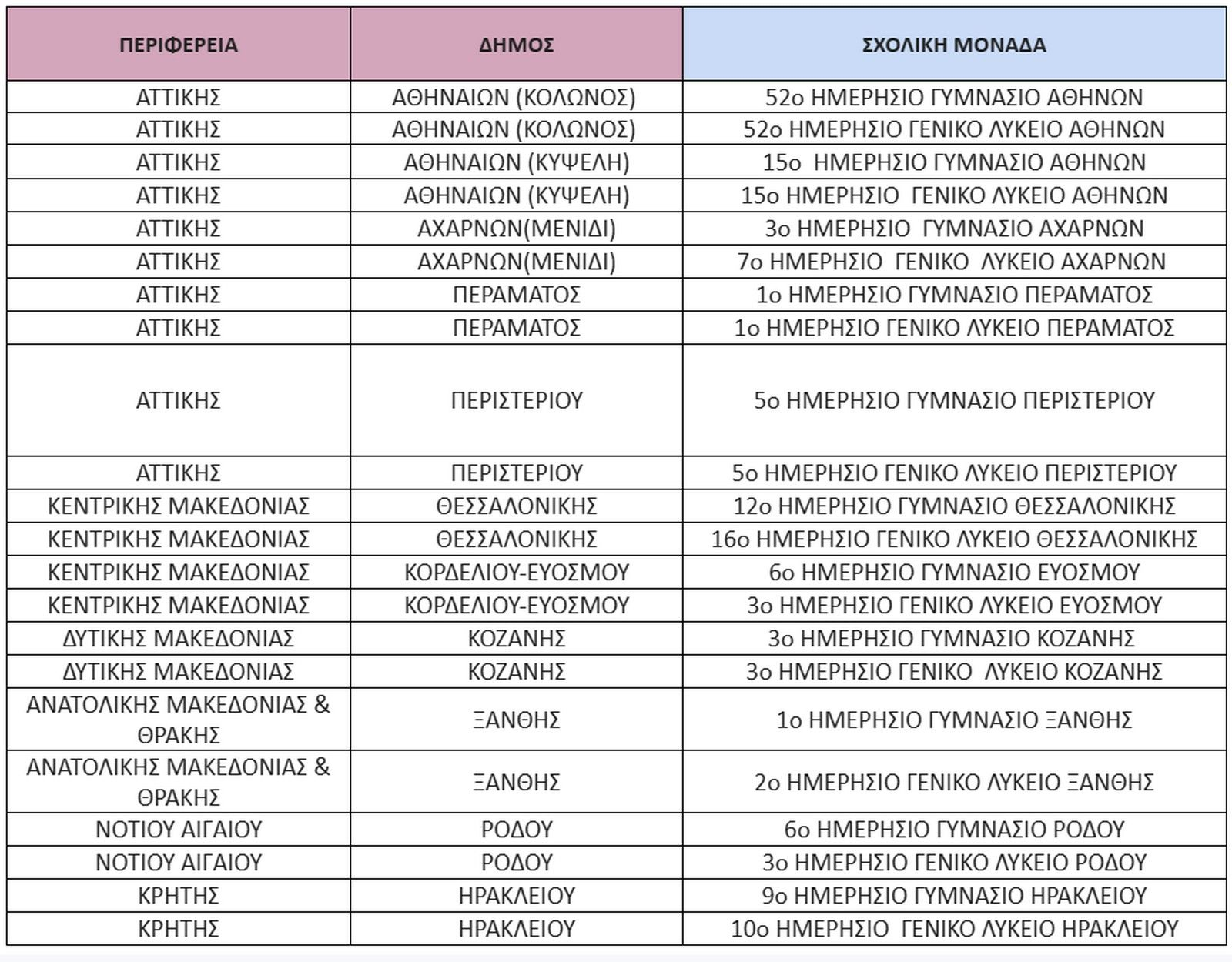 Τα 22 πρότυπα σχολεία θα ιδρυθούν στις εξής περιοχές Κολωνός και Κυψέλη, Μενίδι, Πέραμα, Περιστέρι, Κορδελιό, Κοζάνη, Ξάνθη, Ρόδος και Ηράκλειο Κρήτης.