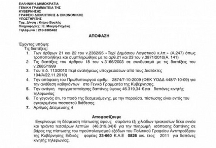 Κονδύλι χιλιάδων ευρώ ενέκρινε η Γενική Γραμματεία της Κυβέρνησης για την πληρωμή κινητών τηλεφώνων στο πολιτικό γραφείο του Θ. Πάγκαλου. Δείτε το έγγραφο της απόφασης