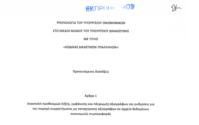 Ας πάρουμε ως παράδειγμα την τελευταία τροπολογία του νομοσχεδίου στον προαναφερόμενο νέο κώδικα δικαστικών υπαλλήλων. Αυτή κατατέθηκε από το υπουργείο Οικονομικών και ήταν εκπρόθεσμη, αφού ήρθε στη Βουλή το απόγευμα της ημέρας που ψηφίστηκε το νομοσχέδιο. Γι’ αυτό τον λόγο και το έγγραφό της συνοδεύτηκε από τη σήμανση «ΕΚΠΡΟΘΕΣΜΟΣ» στην πρώτη σελίδα της.