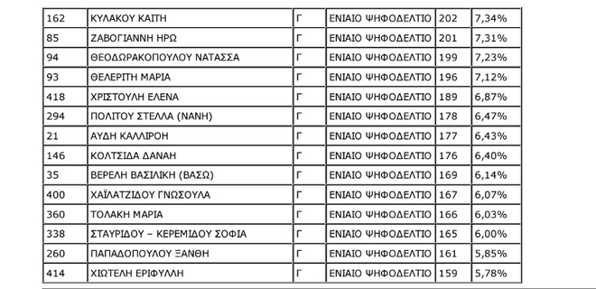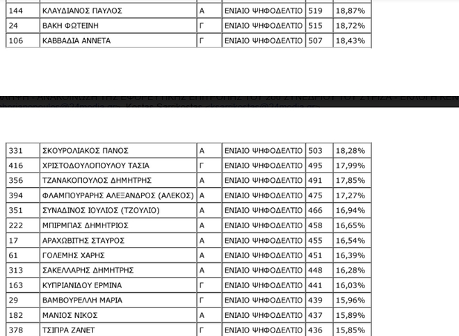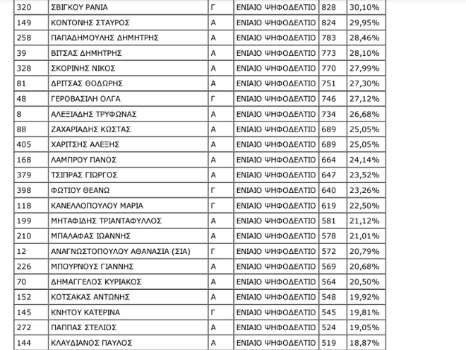 Την πρώτη δεκάδα συμπλήρωσαν οι Πάνος Σκουρλέτης (1.157), Παύλος Πολάκης (1.137), Νίκος Παππάς (1.106), η Ρένα Δούρου (1.090), η οποία είναι η μοναδική γυναίκα στους 10 πρώτους σε ψήφους και η μοναδική που δεν είναι στέλεχος της κυβέρνησης.