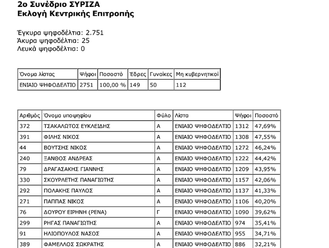 Ο Αλέξης Τσίπρας έλαβε 2.548 ψήφους, ενώ υπήρξαν 176 λευκά και 34 άκυρα.