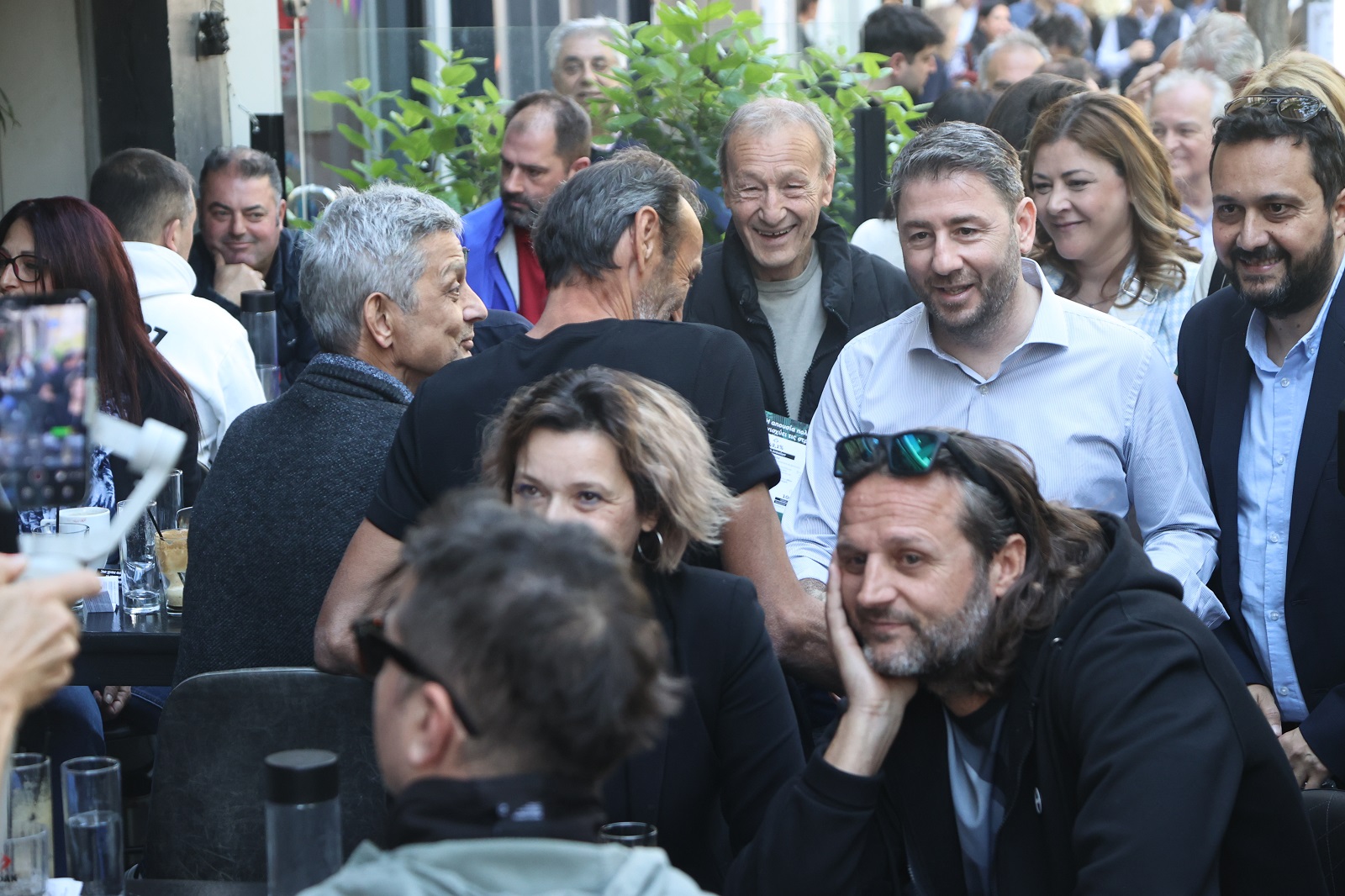 Έπειτα από τη σύντομη περιοδεία, ο κ. Ανδρουλάκης κάθισε σε καφέ της Καλαμαριάς μαζί με τους υποψήφιους του κόμματος του.