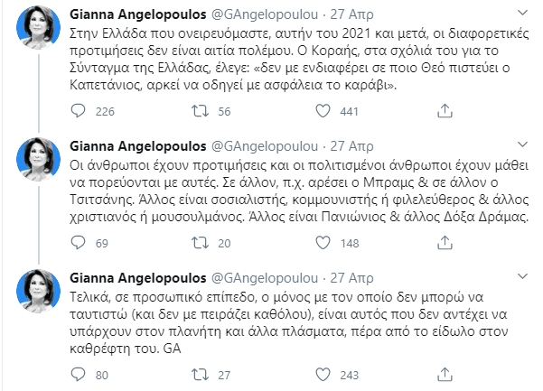 “Στην Ελλάδα που ονειρευόμαστε, αυτήν του 2021 και μετά, οι διαφορετικές προτιμήσεις δεν είναι αιτία πολέμου. Ο Κοραής, στα σχόλιά του για το Σύνταγμα της Ελλάδας, έλεγε: «δεν με ενδιαφέρει σε ποιο Θεό πιστεύει ο Καπετάνιος, αρκεί να οδηγεί με ασφάλεια το καράβι».