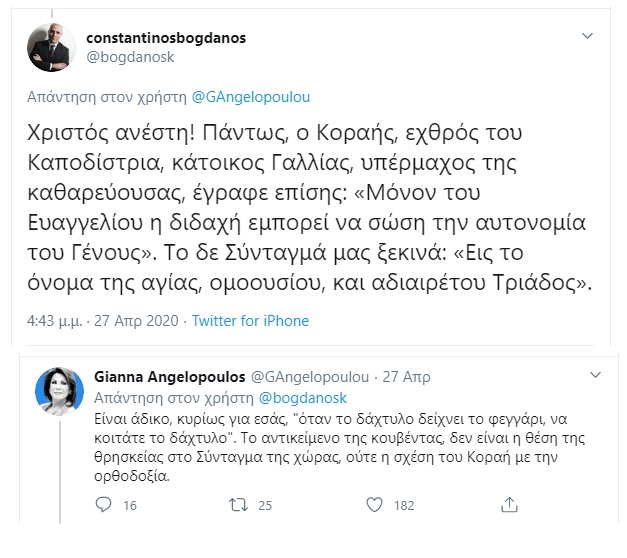 Απαντώντας, η κ. Αγγελοπούλου σχολίασε χαρακτηριστικά: “Είναι άδικο, κυρίως για εσάς, “όταν το δάχτυλο δείχνει το φεγγάρι, να κοιτάτε το δάχτυλο”. Το αντικείμενο της κουβέντας, δεν είναι η θέση της θρησκείας στο Σύνταγμα της χώρας, ούτε η σχέση του Κοραή με την ορθοδοξία”.