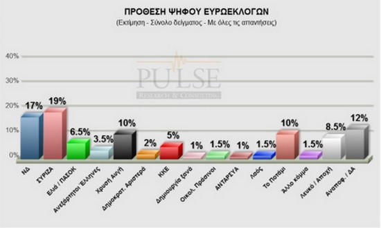 Πιο συγκεκριμένα, στη δημοσκόπηση της Pulse RC για την εφημερίδα “Το Ποντίκι” την Πέμπτη, φέρνει, ως προς την πρόθεση ψήφου στις ευρωεκλογές προβάδισμα του ΣΥΡΙΖΑ κατά 2% έναντι της ΝΔ, αλλά με μείωση του ποσοστού και των δύο κομμάτων.
