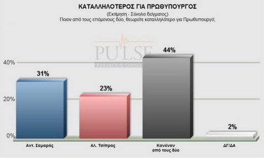 Συγκεκριμένα, το 31% θεωρεί τον κ. Σαμαρά καταλληλότερο για πρωθυπουργό, το 23% τον κ. Τσίπρα, ενώ το 44% απαντά κανένας από τους δύο.